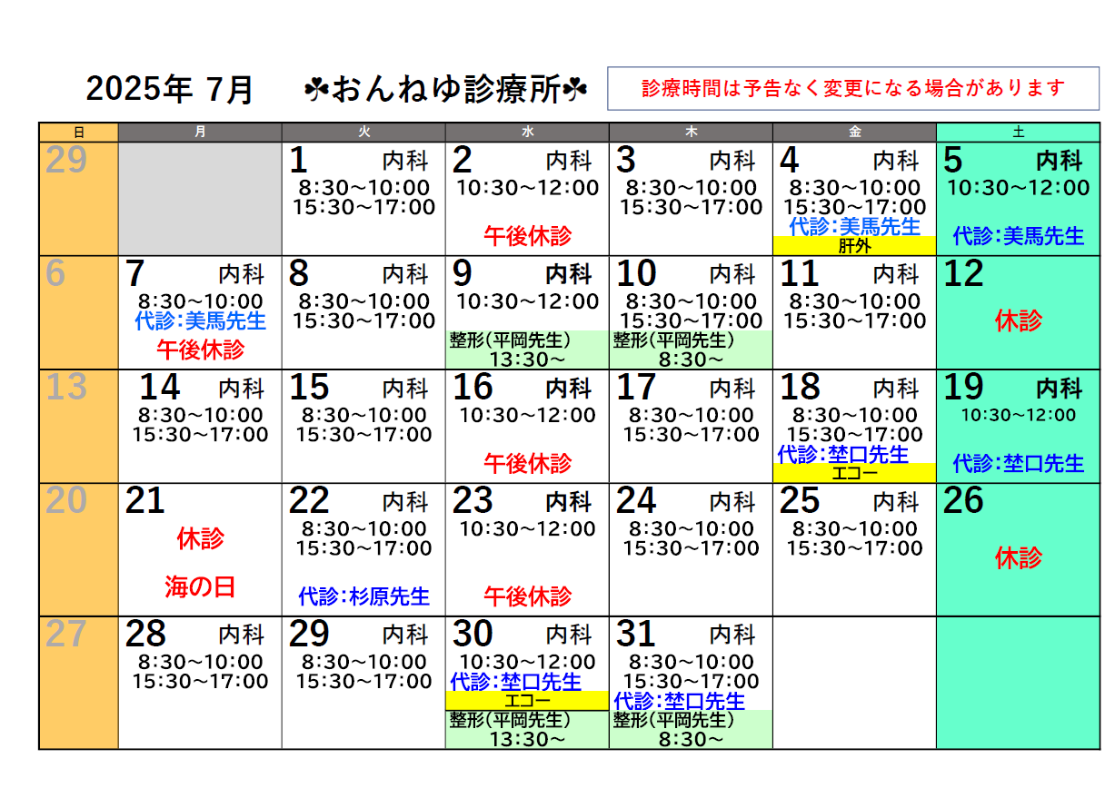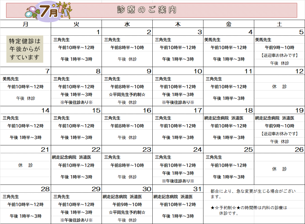 ※都合により、急な変更が生じる場合がございます※※受付は終了時間の15分前までにお願いいたします※